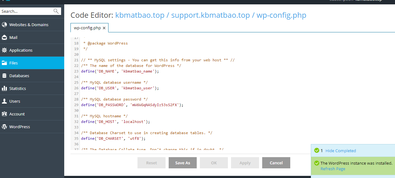 Sau đó vào cấu hình chuỗi kết nối bằng cách vào click vào Wp-config.php → Đổi tên Database và tên User Database